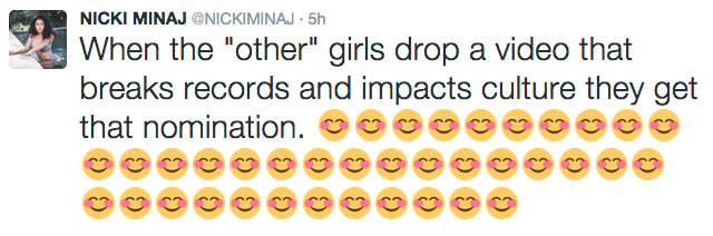 The Barbz first questioned immediately why "Anaconda' wasn't nominated for Video of the Year. Anaconda broke the 24-streaming record on Vevo by having 19.6 million views within its first day of being released. The video broke the record and had EVERYONE talking about it. The buzz around the video, song, choreography, and cover art were being talked about non-stop. It was hard not to know about the video. The cover art caught like wildfire and immediately had numerous memes like these.People couldn't stop talking about it. The twerk and booty filled video had plenty to talk about as well. With all the hype around the video and the fact that it broke the 24 record, it was deserving of being nominated for the Video of the Year; but it didn't get that recognition. Not only were Barbz upset, but Nicki was too.